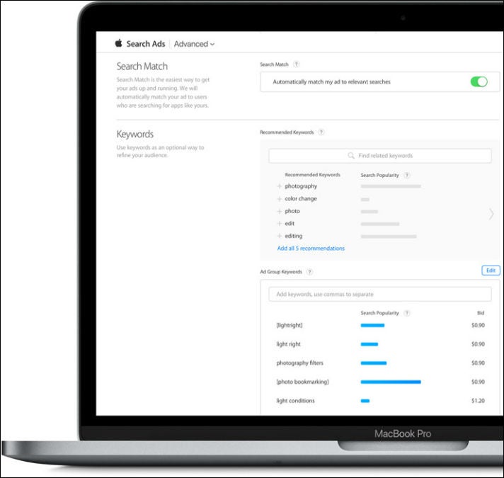 Seit dem vergangenen Dezember bietet Apple zudem ein weiteres Kampagnenmodell an: Bei den Search Ads Basic geben die Werbetreibenden einfach ihr Budget und den maximalen Preis an, den sie bereit sind, pro Installation zu zahlen (Cost per Install, CPI). Apple bucht dann automatisiert für die Kunden auf Basis des App Store Eintrags entsprechende Keywords. Das Basic-Format richtet sich jedoch nur an kleinere Entwickler mit einem Budget von bis zu 5.000 US-Dollar. Die Variante, bei der die Entwickler selbst auf Keywords bieten, firmiert seit der Einführung der Basic-Variante unter dem Namen Search Ads Advanced.