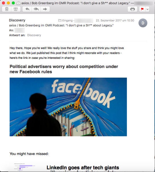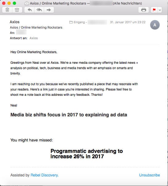Doch offensichtlich wollen die Axios-Macher nicht nur darauf vertrauen, dass die Leser von alleine zu ihnen gelangen. Darauf lassen E-Mails schließen, die Axios-Mitarbeiter an OMR geschickt haben. „Hey Online Marketing Rockstars, hier schreibt Euch Neal von Axios“, heißt es in der ersten Mail, die uns Ende Januar, also nicht einmal zwei Wochen nach dem Start von Axios erreicht hat. „Ich kontaktiere Euch, weil wir vor Kurzem ein Stück veröffentlicht haben, dass Eure Leser vielleicht interessieren könnte. Hier ein Link, falls Ihr das Ganze teilen wollt.“