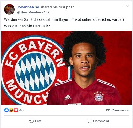 Rund 14.500 Mitglieder zählt die geschlossene Facebook-Gruppe „Bayern-Insider“ aktuell (Stand: 25. Juni 2019). In der kurzen Beschreibung heiĂźt es: „Diskutiert mit Christian Falk, FuĂźball-Chef der BILD-Gruppe und Bayern-Insider, ĂĽber aktuelle Themen zum FC Bayern. Neue Nachrichten rund um die Bayern? Hier erfahrt ihr es aus erster Hand.“ Und genau das können die Mitglieder der etwa vor einem Jahr erstellten Gruppe auch. Ein aktuell besonders intensiv diskutiertes Thema: der mögliche Transfer vom deutschen Nationalspieler Leroy SanĂ© von Manchester City zu Bayern MĂĽnchen. Ein aktueller Beitrag mit der Frage, ob die Fans den FlĂĽgelstĂĽrmer in diesem Jahr tatsächlich noch im Trikot des Rekordmeisters sehen werden, kommt schon nach rund einer Stunde auf 131 Kommentare und 46 Likes.Â