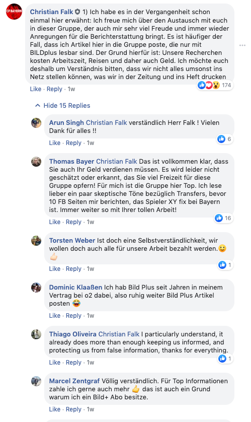 Andreas Rickmann geht in dem Beitrag sogar noch einen Schritt weiter: Der direkte Kontakt zu Reportern, in diesem Fall Christian Falk, könne das Vertrauen der Leser in die Marke erhöhen – und so auch zu einer erhöhten Bereitschaft fĂĽhren, dass sie ein Paid-Abo abschlieĂźen. Falk bekomme zwar hin und wieder Beschwerden, dass er immer wieder auch Links zu Bild Plus-Artikeln teilt (die nur mit einem kostenpflichtigen Abo abrufbar sind), wie er in einem Gruppenbeitrag am 13. Juni schreibt. Die Reaktionen auf seine Erklärungen zeigen aber, dass der GroĂźteil der Gruppen-Mitglieder kein Problem damit zu haben scheint.Â