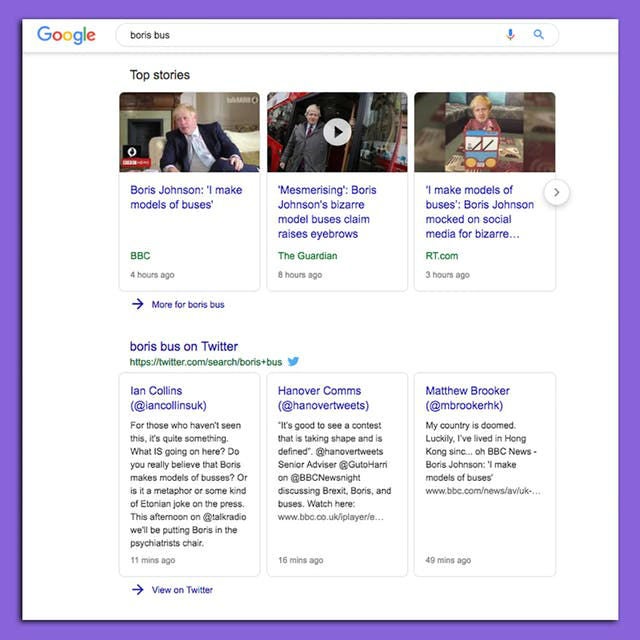 Das Ergebnis einer Google-Suche nach „boris bus“ in Großbritannien nach Johnsons Interview (Screenshot: Parallax)