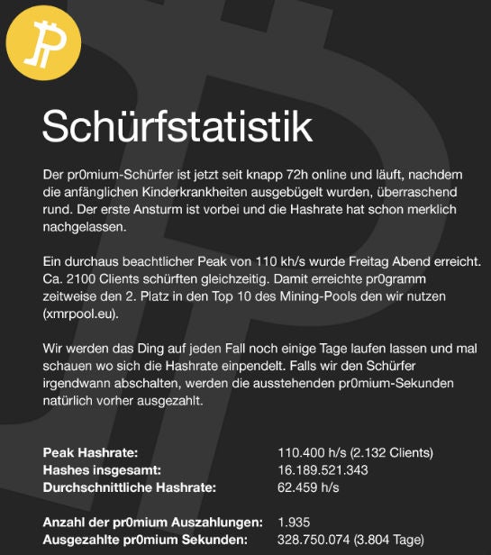Die Schürfstatistik von Pr0gramm nach 72 Stunden (Quelle)