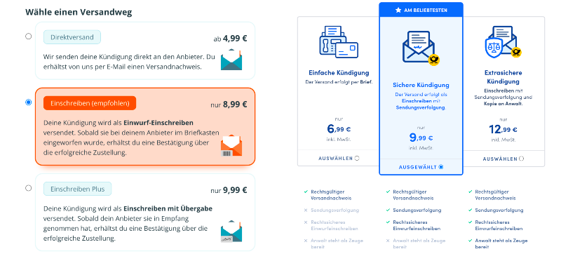 Aber wie machen Unternehmen wie Aboalarm und Volders überhaupt Geld? Sehr einfach erklärt: Sie lassen sich die Durchführung der Kündigungen bezahlen. Beide bieten dabei unterschiedliche Leistungsstufen. Bei Aboalarm gibt’s den einfachen Versand einer Kündigung inklusive rechtlichem Versandnachweis für 4,99 Euro. Bei Volders kostet die Leistung 6,99 Euro. Eine Kündigung per Einschreiben inklusive Sendungsverfolgung kostet 8,99 Euro (Aboalarm) und 9,99 Euro (Volders). Das Premium-Produkt bei Aboalarm ist das Einschreiben mit Übergabe für 9,99 Euro. Volders gibt zusätzlich eine Kopie zum Anwalt und verlangt dafür 12,99 Euro.