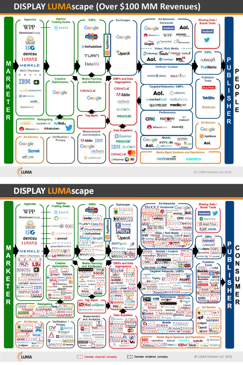 Auch wenn der direkte Vergleich zwischen der vollständigen Display Lumascape-Infografik und der bereinigten Versionen auf den ersten Blick vielleicht schockiert, wirklich überraschen sollte er nicht. Seit Jahren sind die Probleme der Adtech-Branche bekannt: Die Technologien an sich sind nur schwer zu verstehen, Adblocking und Fraud-/Bot-Traffic untergraben das Geschäftsmodell. Facebook und Google scheinen mit ihren „Walled Gardens“ am längeren Hebel zu sitzen (85 Prozent von jedem neu im Online Marketing ausgegebenen US-Dollar ging laut Morgan Stanley im ersten Quartal 2016 an eines der beiden Unternehmen).
