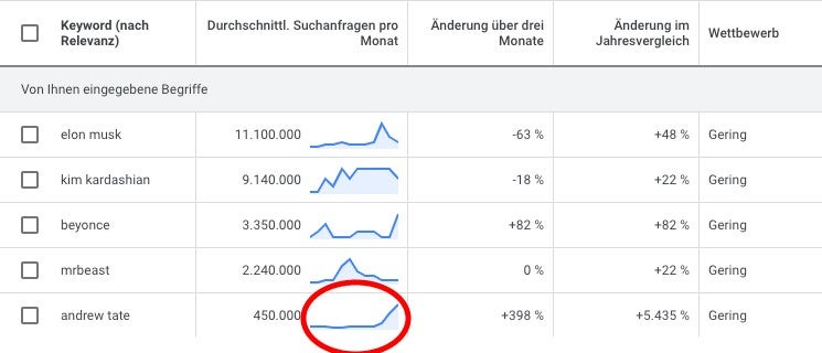 Er werde mittlerweile häufiger gegooglet als Donald Trump, behauptete Tate vor Kurzem in einem Podcast – offenbar auf Basis von Daten von Google Trends. Ruft man die Suchvolumina über Googles Keyword Planer ab, ergibt sich jedoch ein anderes Bild: An die Zahl der Suchanfragen von Trump oder anderen Promis wie Elon Musk und Kim Kardashian kommt Tate zwar noch nicht heran. Im Vorjahresvergleich ist das Suchvolumen zu seinem Namen jedoch um mehr als 5.000 Prozent gestiegen – auf nun fast eine halbe Million Suchabfragen im Monat.