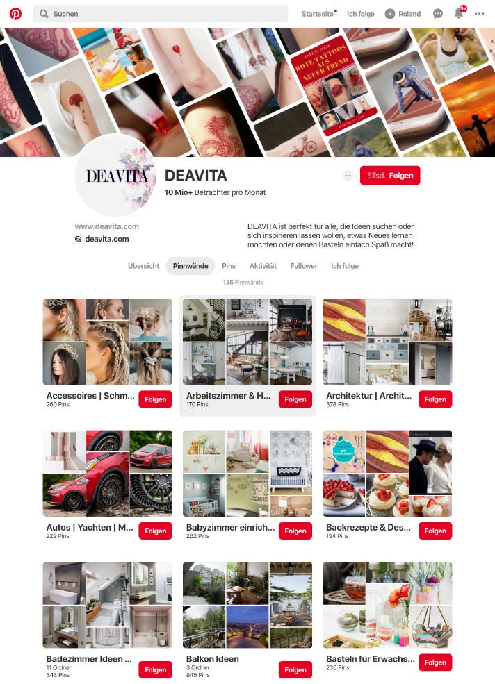 Wer als deutscher Nutzer schon einmal auf Pinterest nach Einrichtungs-, Dekorations- oder Bastelideen, Frisur- oder Kosmetik-Tipps oder nach Rezepten gesucht hat, ist mit hoher Wahrscheinlichkeit schon einmal auf die Inhalte der Arch Media Group gestoßen. Das Unternehmen betreibt offenbar mehrere der reichweitenstärksten deutschen Pinterest-Boards zu den genannten Themen – unter Namen wie „Deavita“ (mehr als zehn Millionen Betrachter im Monat), „Freshideen“ (mehr als zehn Millionen Betrachter im Monat), „Archzine“ (8,9 Millionen Betrachter im Monat) und „Alleideen“ (8,3 Millionen Betrachter im Monat) – und lenkt damit enorme Nutzermassen auf die eigenen Websites.