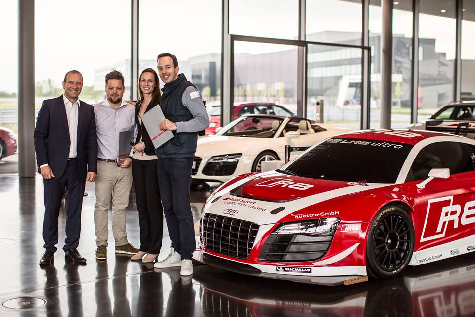 Philipp Westermeyer (l.) und Jasper Ramm (2. v. l.) mit Thomas Müller (Leiter Digitales Marketing Deutschland) und Jessica Höpfl (Digitales Marketing) von Audi und dem neuen Rockstars-e-tron.