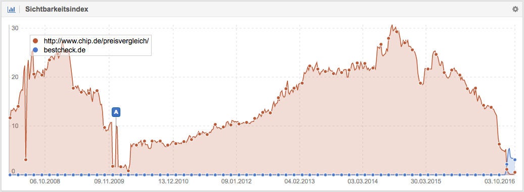 Die Entwicklung der Google-Sichtbarkeit des Chip-Preisvergleichs und von Bestcheck.de im Vergleich