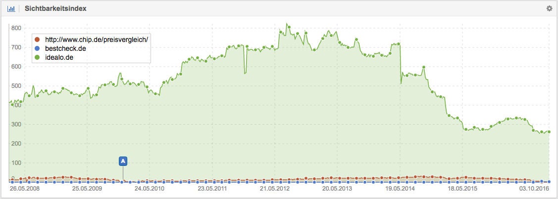 Die Entwicklung der Google-Sichtbarkeit von Idealo (grün) im Vergleich zum Chip-Preisvergleich und zu Bestcheck