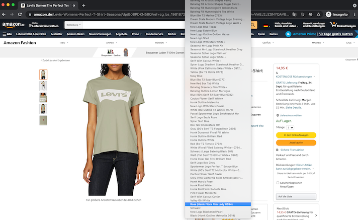 Obwohl sich die hier gelisteten Shirts in Farbe, Passform und Print unterscheiden, enthalten alle Varianten eine sogenannte Parent-ASIN. Bei jeder Bestellung eines der vielen T-Shirts klettert die gemeinsame Parent-ASIN im Ranking nach oben. Wie auf dem Screenshot erkenntlich, leidet unter diesem Trick zwar die Nutzerfreundlichkeit, da eine riesige Liste erscheint. Anderseits gelingt es so, den Algorithmus zu täuschen und das Produkt im Ranking besser dastehen zu lassen.