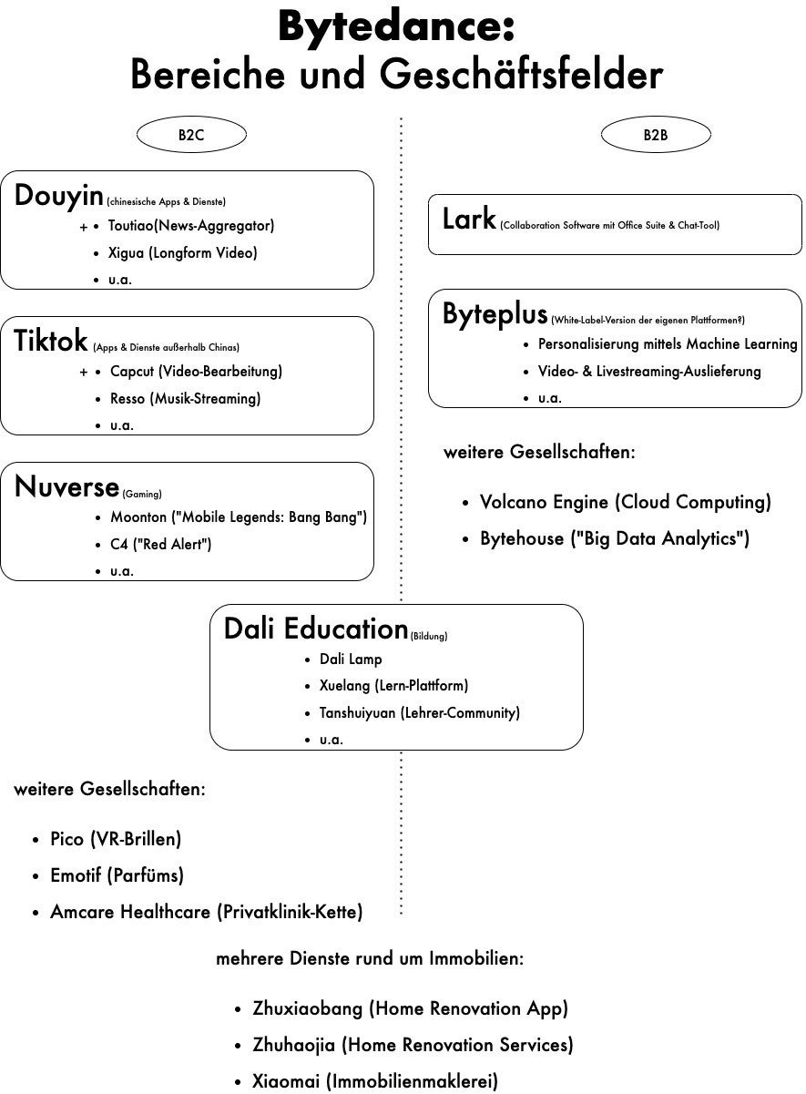 Die sechs Business Units von Bytedance, wie über sie im Rahmen einer Restrukturierung im Herbst 2021 berichtet wurde, im Überblick – ergänzt um weitere Gesellschaften und Geschäftsfelder (Grafik: Roland Eisenbrand)