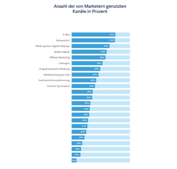 Denkt man länger darüber nach, ist das allerdings auch irgendwie sehr logisch. Die Kanäle bilden eben häufig immer noch das Grundgerüst für Marketer. Und nur weil Homepage und Newsletter keine Trendthemen mehr sind und als Basics weniger Aufmerksamkeit als beispielsweise Social Media Plattformen erfahren, sind sie noch lange nicht irrelevant – im Gegenteil. Entsprechend häufig haben die von Salesforce Datorama befragten Marketer auch weitere eher klassische Kanäle genannt. So landen beispielsweise auch Affiliate Marketing (58 Prozent), Umfragen (53 Prozent) und Direktwerbung per Post (46 Prozent) in den Top 10.