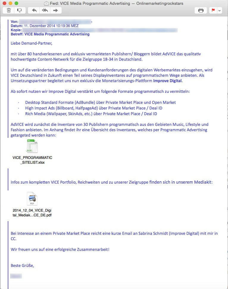Dass nun selbst Publisher wie die des Advice-Netzwerks neben hochpreisiger Selbstvermarktung und grenzenloser Restplatz-Vermarktung Anschluss an den Echtzeit-Handel suchen, zeigt, wo die Hoffnungen, Ressourcen und Planungen hingehen. Wie eine Online Marketing Rockstars vorliegende E-Mail zeigt, will Advice „Desktop-Standard-Formate, High Impact Ads und Rich Media Ads“ von erst einmal 30 seiner nach eigenen Angaben insgesamt 80 deutschen Publisherpartnern über einen Private Market Place verkaufen. Technologiepartner ist das niederländische Unternehmen Improve Digital (mittlerweile eine Tochter der schweizerischen Publigroupe).