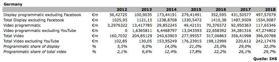 IHS berücksichtigt für die Schätzungen jegliches Inventar, das nach Definition des Interactive Advertising Bureau als „programmatisch“ gilt – darunter sowohl in offenen Auktionen als auch vorab zu Festpreisen verkaufte Werbekontakte. Nicht miteinbezogen ist in die Hochrechnung das Inventar von Facebook. „Wir haben Facebook herausgerechnet, weil deren Geschäft so stark wächst, dass eine Miteinbeziehung das Bild verzerrt hätte“, so IHS-Analyst Daniel Knapp gegenüber Online Marketing Rockstars.