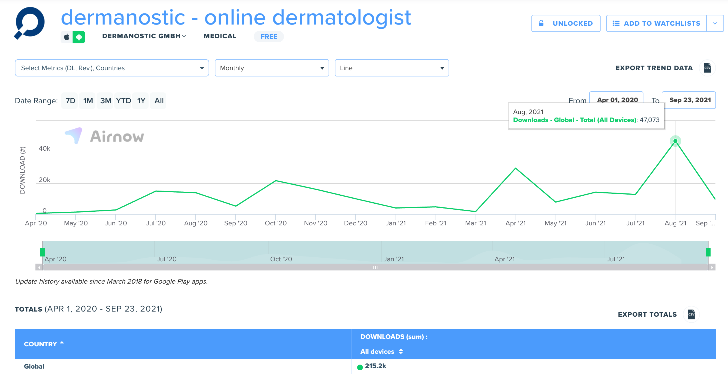 Die Downloads der Android-Version von Dermanostic laut Airnow Data.