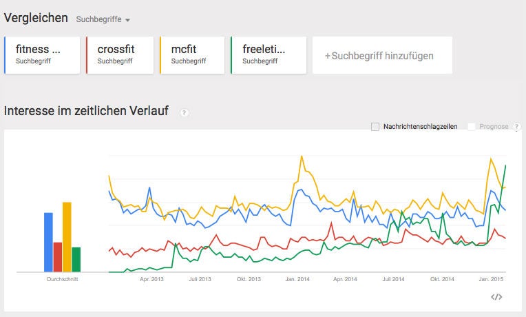 Die Entwicklung der Google-Suchanfragen zu Freeletics (grün), McFit (gelb), Fitness First (blau) und Crossfit (rot) in Deutschland laut Google Trends