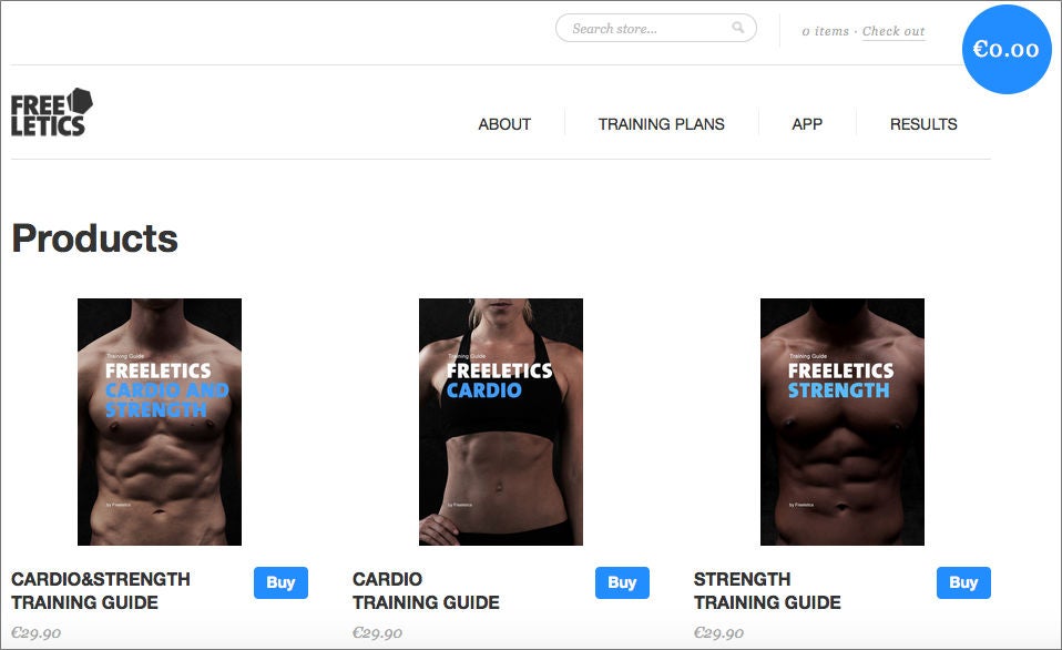 Über eine Shopify-Seite verkauften die Gründer zu Anfang über Freeletics.com drei Trainings-PDFs (Screenshot: Archive.org)