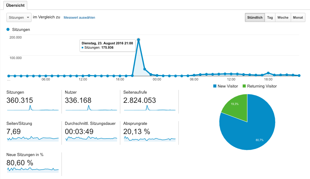 336.168 Besucher und 360.315 Visits am Dienstag, dem 23. August 2016, weist Google Analytics für die Website und den Online-Shop des Dirndl-Startups Limberry aus, wie ein Screenshot zeigt, den die Inhaber des Unternehmens Online Marketing Rockstars exklusiv zur Verfügung gestellt haben. Am Abend dieses Tages stellte Limberry-Gründerin Sibilla Kawala ihr Unternehmen in der Vox-Sendung „Die Höhle der Löwen“ vor (hier ihr Pitch im Video). Limberry produziert und verkauft Dirndl; die Kundinnen können aus einer Vielzahl von Stoffen und Designs ihr individuelles Dirndl zusammenstellen.