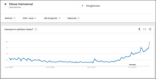 Doch wie ein Blick auf die Entwicklung von Googles Suchanfragen zeigt, hat die Nachfrage nach Ellesse in den vergangenen zwei Jahren wieder stark zugenommen. Markeninhaber Pentland lässt verlautbaren, dass Ellesse trotz schwieriger Situation in einigen Märkten im zurückliegenden Geschäftsjahr die Erwartungen übertroffen und den Umsatz um 45 Prozent gesteigert habe.