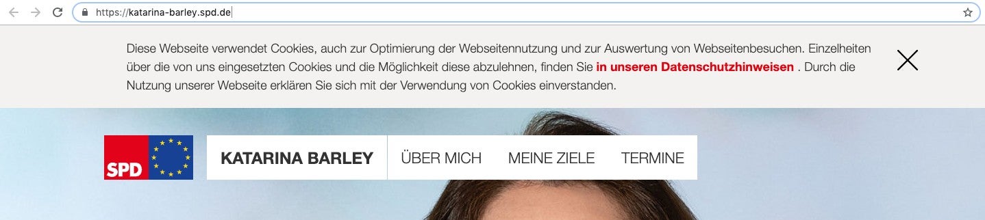 Nicola Beer von der FDP und Katarina Barley von der SPD informieren auf ihren Webseiten zwar beide jeweils mit einem Banner über die Cookie-Speicherung, eine Wahl darüber, ob diese akzeptiert oder abgelehnt wird, haben die Besucher aber bei beiden nicht. Bei Barley findet sich im Banner außerdem noch der Hinweis: „Durch die Nutzung unserer Webseite erklären Sie sich mit der Verwendung von Cookies einverstanden.“ Ein Link führt dann zu den Datenschutzhinweisen auf die Domain der SPD – wer der Verarbeitung seiner Daten für Werbezwecke widersprechen möchte, müsse eine kurze Mail an den Datenschutzbeauftragen schreiben.