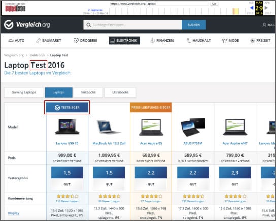 Früher war auf vergleich.org von Testsiegern die Rede (bearbeiteter Screenshot, Quelle: Wayback Machine)