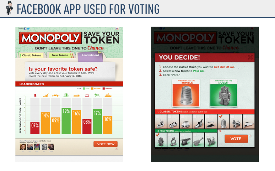 Im Auftrag des Spieleherstellers Hasbro sollte Vaynermedia das altbekannte Brettspiel Monopoly zurück in den Fokus der Öffentlichkeit rücken. Die Agentur rief zu einer öffentlichen Abstimmung darüber auf, welche der Spielfiguren unter den Verbrauchern am beliebtesten ist – die am wenigsten beliebte sollte durch eine neue, ebenfalls durch die Teilnehmer wählbare Figur ersetzt werden. Andere Marken und Medien nahmen an der Kampagne teil und fieberten unter dem Motto „Save your token“ um das Schicksal „ihrer Spielfigur“. Schließlich wurde das am wenigsten beliebte Bügeleisen durch – nach einer Online-Kampagne wenig erstaunlich – eine Katze ersetzt. Im Quartal nach Kampagnenende übertraf das Geschäftsergebnis von Hasbro die Erwartungen der Wallstreet-Analysten. Die Monopoly-Kampagne habe zu dem Umsatzwachstum entscheidend beigetragen.