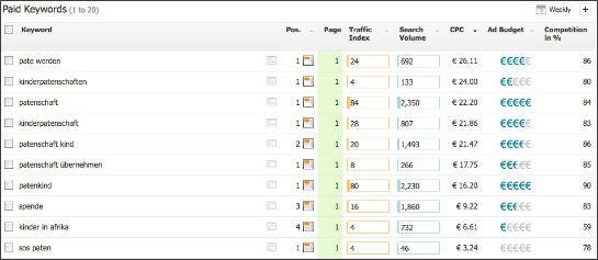Wer bei Google Adwords beispielsweise auf das Keyword „spende“ bieten möchte, muss aktuell mit einem durchschnittlichen Cost-per-Click von um die neun Euro rechnen. Noch teurer sind Anzeigen zu Keywords rund um das Thema Patenschaft, sichern diese den Organisationen doch keine einmaligen Spenden, sondern einen regelmäßigen Mittelzufluß. So rangierten die Keywords „kinderpatenschaft“ und „patenschaft“ im Jahr 2015 laut Searchmetrics mit einem CPC von 26,74 Euro bzw. 24,59 Euro in der Top 50 der teuersten Keywords. Aktuell beträgt der durchschnittliche CPC zum Keyword „patenschaft“ 22,20 Euro; das Keyword-Kombination „pate werden“ schlägt mit 26,11 Euro zu Buche.