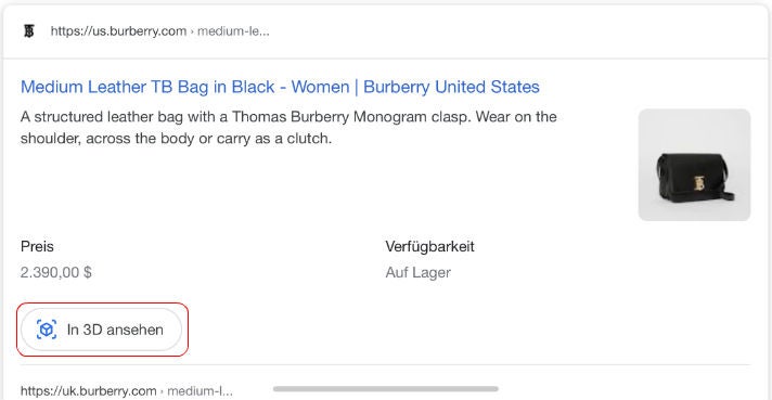 Knappe 2.400 US-Dollar soll die „Medium Leather TB Bag“ der britischen Luxusmarke Burberry kosten. Potenzielle Käuferinnen, die, bevor sie diesen stolzen Preis im Burberry-Online-Shop bezahlen, erst einmal testen wollen, ob die Tasche überhaupt zu ihrer Garderobe passt, können das seit Kurzem direkt aus der Google-Suche heraus. Wer über die Mobile-Version von Google nach „burberry medium leather tb bag“ sucht, der oder die kann seitdem ein entsprechendes virtuelles 3D-Modell aufrufen und über die Handy-Kamera beispielsweise neben einem bereits bestehenden Outfit platzieren. Eine gesonderte App ist dafür nicht notwendig.