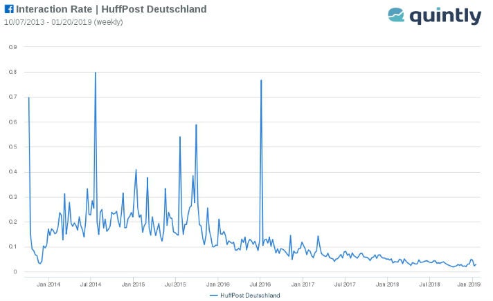 Die Interaktionsrate der deutschen Facebook-Seite der Huff Post ist im Lauf der Zeit immer weiter zurückgegangen (Quelle: Quintly)