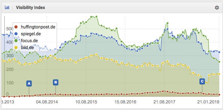 Die Entwicklung der Google-Sichtbarkeit der deutschen Huff Post im Vergleich zu anderen großen deutschen Medienmarken