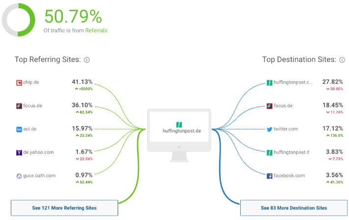 Möglicherweise hat sich die deutsche Huff Post bei der kosteneffizienten Generierung von Traffic schwer getan. Um Klicks für die Huff Post zu generieren, hat Burda offenbar viele Besucher anderer hauseigener Portale zur Huff Post weitergeschoben. Nach Schätzungen des Traffic Tools Similar Web lag der Anteil des „Referral Traffics“ am Gesamtbesucheraufkommen der deutschen Huff Post im zurückliegenden Dezember bei 50 Prozent. Ein Großteil davon stammt von den Burda-eigenen Portalen Focus und Chip.