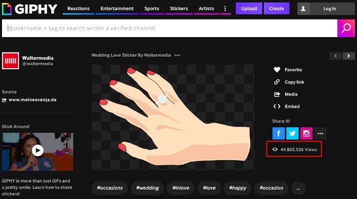 Die Münchner Bloggerin Svenja Walter berät bereits Unternehmen und Prominente (vor allem aus der Entertainment-Branche) bei der Erstellung von GIFs und bietet darüber hinaus einen eigenen GIF-Online-Kurs an. Zuvor hatte Walter ein ähnliches Erfolgserlebnis wie Bubela: Ein von ihr erstelltes GIF, das eine Hand mit einem Verlobungsring zeigt, rankte zu den Suchbegriffen „wedding“ und „engagement ring“ in den Top 5 der Suchergebnisse bei Giphy. „Ich war im Urlaub und deswegen für ein paar Tage offline. Als ich wieder kam, hatte das GIF plötzlich mehr als 40 Millionen Views“, so Walter im Gespräch mit OMR. „Ich habe dann gesehen, dass das GIF noch mit zwei weiteren Hashtags vertaggt war, die nicht von mir stammen. Ich gehe davon aus, dass die von Giphy händisch hinzugefügt worden sind.“