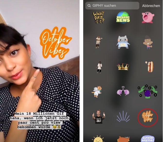 „Ich habe gerade die Statistik meiner GIFs gecheckt und war total baff, weil eines meiner GIFs fast 18 Millionen Aufrufe hat“, berichtet Janika Bubela, bei Instagram als „Yanikasblog“ vor Kurzem ihren Followern in einer Instagram Story. Das von Bubela erstellte GIF, ein Schriftzug „October Vibes“, war offensichtlich in der GIF-Sticker-Suche von Instagrams Story-Camera-Modus unter den aktuellen GIF-Vorschlägen eingeblendet worden. Innerhalb kürzester Zeit sammelte es dadurch Millionen von Aufrufen an.