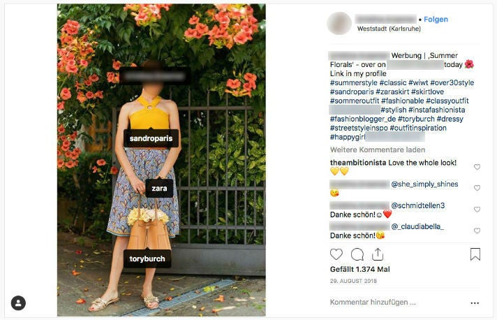 Ein weiterer auffälliger Account ist der einer Modebloggerin aus Baden Württemberg, die viele ihrer Instagram-Posts ebenfalls als Werbung deklariert. Kristina K. verzeichnet rund 41.000 Abonnenten; Influencerdb bewertet die Reichweite mit der Note „D-„, also „ausreichend“ mit der Tendenz zu „mangelhaft“. In einem ihrer als Werbung gekennzeichneten Fotos bewirbt sie nicht nur die Fast-Fashion-Marke Zara, sondern auch die beiden Designer-Labels Sandro Paris sowie Tory Burch. Auch hier ist in der Frage, ob die Posts wirklich bezahlt sind, zumindest eine gesunde Portion Skepsis angebracht.