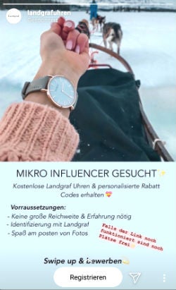 Wie viel Potenzial in Nano-Influencern steckt, belegt die Entwicklung von Landgraf Uhren. Die Affiliate-Konditionen des Unternehmens sind vergleichsweise schlecht: Die Influencer-Partner des Unternehmens erhalten auf ihre Bestellungen 20 Prozent Rabatt, deren Follower 10 Prozent. Wenn der Rabattcode zweimal eingelöst wurde, bekommen die Affiliates eine Uhr von Landgraf geschenkt. Geld gibt es gar keins.