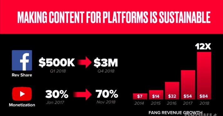 Peretti hat jetzt aber Hoffnung, dass die Plattformen ihre Content-Partner stärker beteiligen, weil sie so sehr mit Falschmeldungen zu tun haben und auf vertrauenswürdige Quellen zugehen müssen. Buzzfeed habe 2018 insgesamt 84 Millionen US-Dollar Umsatz mit der Monetarisierung auf Facebook, Amazon, Netflix und Google gemacht. Aus seiner Sicht sei es also ein valides Geschäftsmodell, Content für die Plattformen zu machen. Abhängig bleiben die Publisher damit allerdings weiterhin. Diese Abhängigkeit hat erst vor Kurzem zu Entlassungswellen und Gerüchten über Fusionen großer digitaler Medienmarken geführt.