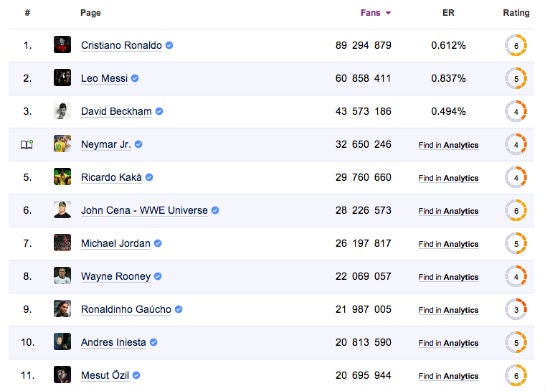 Messi gegen Ronaldo. Das ist nicht nur ein jahrelanger Kampf zweier Superstars um die Auszeichnung zum Weltfußballer. Es ist auch ein Kampf zweier Weltkonzerne: Adidas gegen Nike. Zwar hat der kleine Argentinier die persönliche Sporttrophäe in den letzten Jahren häufiger gewonnen, auf Facebook hingegen hat der extrovertierte Portugiese Cristiano Ronaldo mit knapp 90 Millionen Fans deutlich die Nase vorn. Damit belegt er laut Socialbakers weltweit den ersten Platz in Sachen Sportler-Fanpages. Etwas abgeschlagen auf Platz zwei, aber immerhin auch mit über 60 Millionen Fans, folgt Lionel Messi.