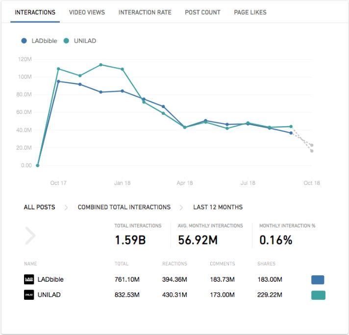 Auch wenn beide Seiten immer noch Millionen von Menschen erreiche , so werden ihre Inhalte im Vergleich doch deutlich seltener in den Newsfeeds der Nutzer ausgespielt. Darauf lassen die Statistiken aus mehreren Tools schließen. So zeigt das Facebook-Publisher-Tool Crowdtangle (mittlerweile im Besitz von Facebook selbst), dass die Interaktionsrate und die Zahl der Interaktionen sowohl bei Unilad als auch bei Ladbible stark zurückgegangen ist. Zu Anfang dieses Jahres erfolgte der jüngste Einbruch.
