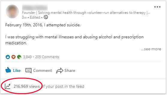 Ob die und in welchem Maße die Posts auf der tatsächlich stattgefundenen Ereignissen beruhen, ist von außen kaum zu erkennen. Andere Nutzer, die unter den Posts kommentieren, scheinen den Geschichten Glauben zu schenken. „Inspirierend!“, schreibt ein Linkedin-Nutzer, „Es ist wichtig, dass wir uns nicht selbst aufgeben“ ein anderer. Wie die Screenshots des „Growth Hackers“ zeigen, hat nur einer der Posts eine vierstellige Zahl an Views, die meisten deutlich fünfstellige Zahlen, einer sogar über 200.000 Views. Er habe dieses Engagement ohne die Zuhilfenahme von Pods generieren können (wir hatten bereits an dieser Stelle über die „Likest Du meinen Post, like ich Deinen“-Gruppen geschrieben).