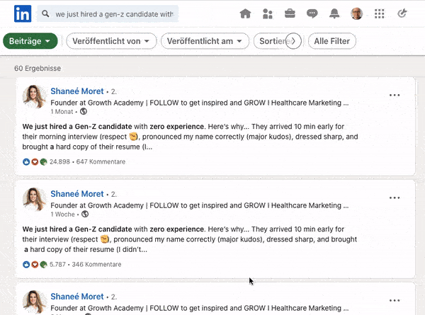 Ein Blick in die Ergebnisse bei einer LinkedIn-Suche nach dem Satz „we just hired a gen-z candidate with zero experience“