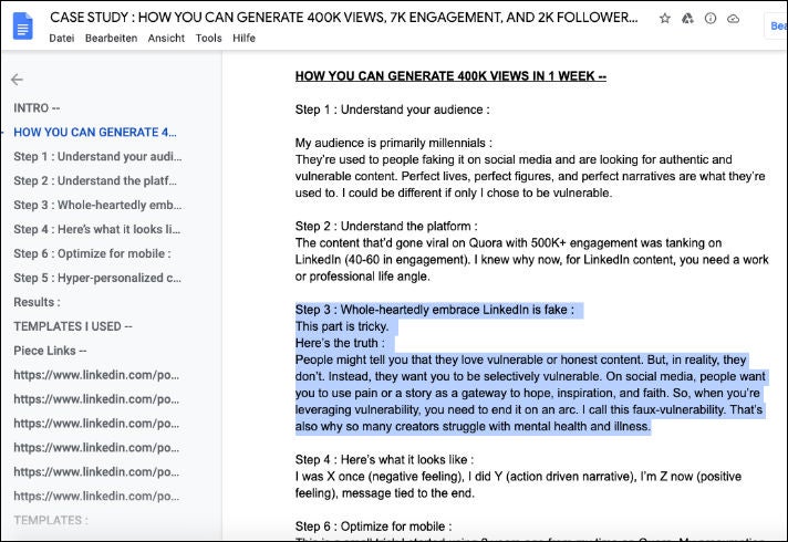 „Du musst Dich vollkommen darauf einlassen, dass LinkedIn fake ist“ – ein Screenshot der „Case Study“, in der ein „Growth Hacker“ Tipps dazu gibt, wie man auf LinkedIn mit viralen Posts enorme Reichweiten generieren kann (Hervorhebung durch OMR)