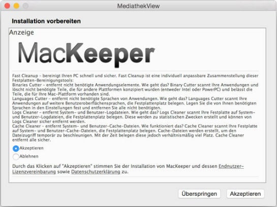 Wer zu schnell weiter klickt, klickt möglicherweise auf „Akzeptieren“: So sieht es aus, wenn man als Mac-Nutzer von Chip die Software MediathekView installieren will, während des Prozesses aber auch den MacKeeper „mit angeboten“ bekommt (Quelle Screenshot: Ifun)