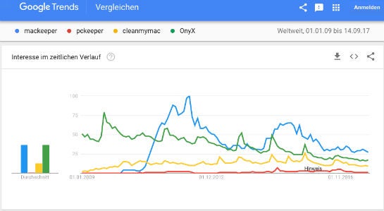 So fragwürdig alle geschilderten Praktiken auch sein mögen, helfen sie doch dabei, den Namen MacKeeper innerhalb relativ kurzer Zeit in alle Welt zu tragen. Wie Google Trends zeigt, wird die Software nicht nur schnell sehr viel bekannter als das Schwesterprodukt PCKeeper, sondern überholt auch schnell Mitbewerber. Im Januar 2012 verzeichnet Google bereits mehr Suchanfragen zu dem Keyword „mackeeper“ als zu „cleanmymac“ – ein Produkt, mit dem der ukrainische Mitbewerber Macpaw bereits früher gestartet war. Im April 2011 holt MacKeeper auch die Konkurrenz von OnyX ein. Ein Jahr darauf erreichen die Suchanfragen ihren Höhepunkt.