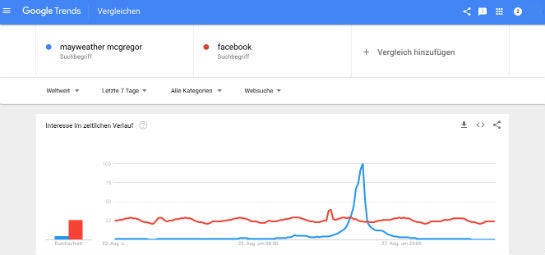 Die Entwicklung der weltweiten Suchanfragen zu den Keywords „mayweather mcgregor“ im Vergleich zu denen zu „facebook“ (Quelle: Google Trends)