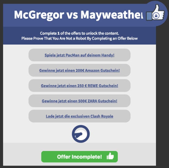 Nutzer, die das Angebot annehmen wollen, werden zu einer „Offerwall“ weitergeleitet, auf der sie aus einem von mehreren „Angeboten“ auswählen können. Klickt man sich weiter durch, wird man meist aufgefordert, Telefonnummer und/oder Adressdaten zu hinterlassen. Uns ist es in keinem Fall gelungen, den „kostenlosen Stream“ auf diese Weise freizuschalten.
