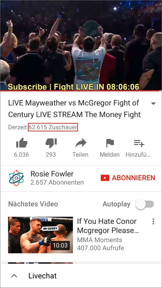Neben Facebook war und ist der Mayweather-McGregor-Kampf auch für Youtube und viele der dort vertretenen Kanalbetreiber ein enormer Traffic-Treiber: 188 Millionen Views habe Googles Video-Plattform rund um das Thema an einem einzigen Tag verzeichnet, schreibt Youtube-Experte Christoph Burseg in einem Facebook-Post. „Das war sicherlich das größte Event auf Youtube in den vergangenen vier Jahren.“