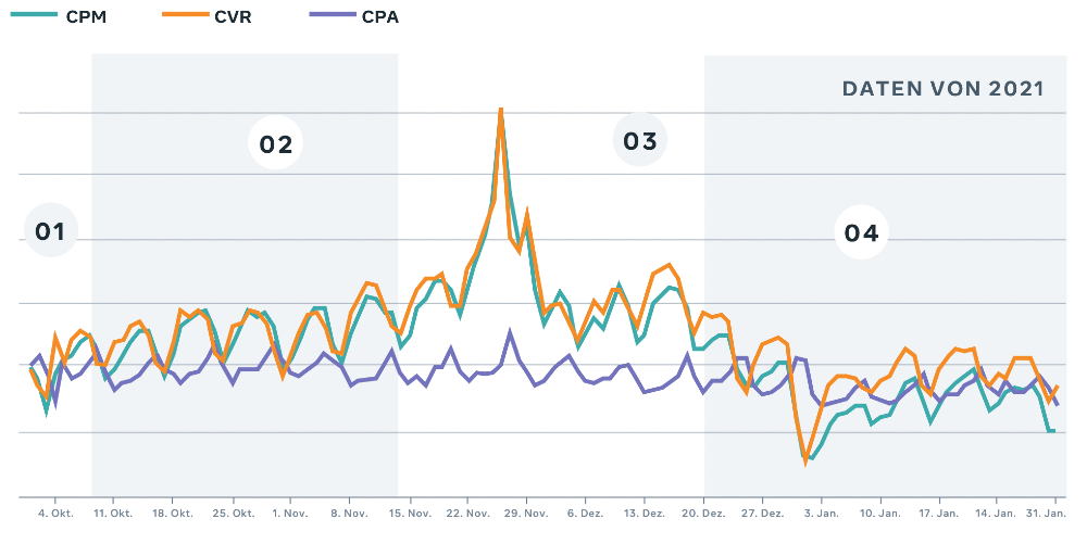 Wenn es um Mega Sales Days (MSDs) geht, beginnt diese Customer Journey übrigens nicht erst kurz vor dem Black Friday, Weihnachten, Valentinstag und so weiter. Am Beispiel der Weihnachtssaison lässt sich der Zyklus in vier Phasen einteilen – wie Ihr am vergangenen Jahr erkennt. In der Vorbereitungsphase bis etwa Anfang Oktober wurden 2021 die Grundlagen gelegt, bis Mitte November dank noch sehr günstiger Impressions potenzielle Käufer:innen bereits erreicht und von Black Friday bis kurz vor Weihnachten Sales und Umsatz maximiert. Auch die vierte Phase, in diesem Fall die Zeit nach Weihnachten, bleibt extrem attraktiv. Der CPM, also der Preis pro tausend Kontakte, sinkt während dieser Zeit stärker, als die Conversion Rates. Es lohnt sich also, weiter zu werben.