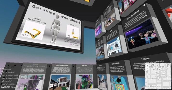 So sei er auch auf Cryptovoxels gestoßen. Das ist eine 2018 gelaunchte, auf der Etherium-Blockchain basierende virtuelle Welt, die man über den Webbrowser oder VR-Headsets betreten kann. Spieler*innen können bei Cryptovoxels gegen Kryptowährung Land erwerben und bebauen. Venzke-Caprarese war früh dran – „Da war alles noch schwarzweiß und nichts los“ – und kaufte fünf Parzellen, dann weitere sieben. Die Preise stiegen. Er stieß eine Parzelle in guter Lage im Wert von 10.000 Euro ab, kaufte andernorts zu. Mittlerweile besitzt Venzke-Caprarese mehr als 100 Cryptovoxels-Grundstücke.