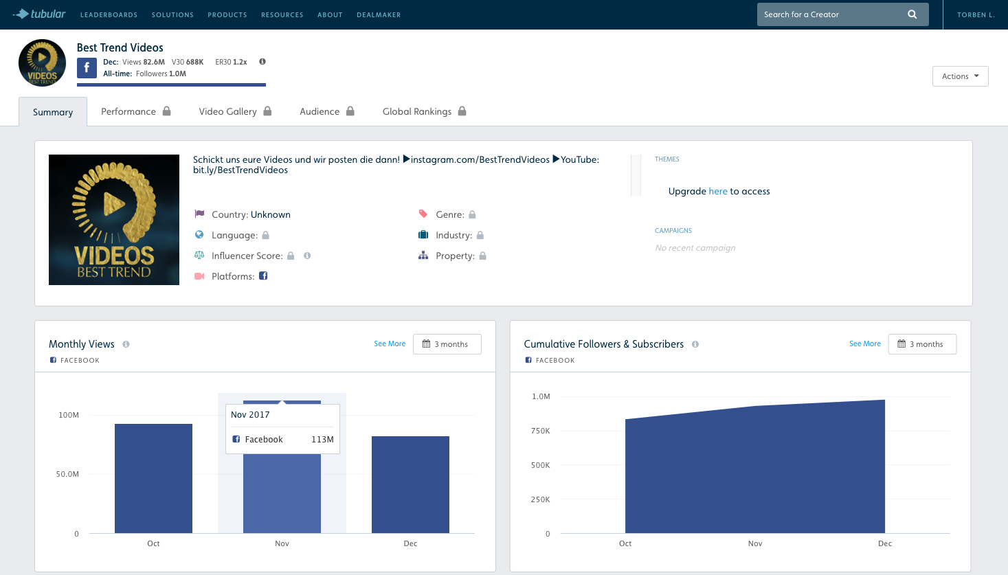Statistiken zu der Facebook-Page „Best Trend Videos“ (Quelle: tubularlabs.com)