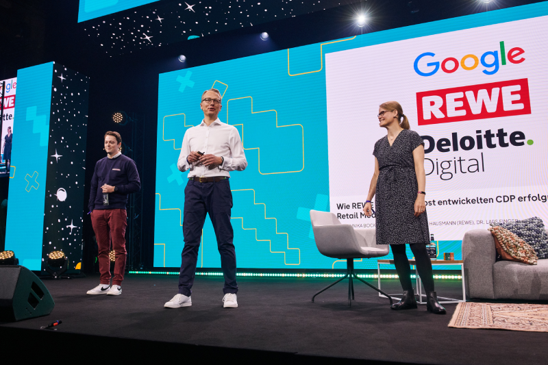 Dr. Jannika Bock (Managing Director Retail, Google), Maximilian Hausmann (Head of Media Strategy & Data-Driven Marketing, REWE) und Dr. Lars Finger (Partner Deloitte Digital, Deloitte Consulting) präsentierten den gemeinsamen Erfolgs-Case der CDP von REWE.